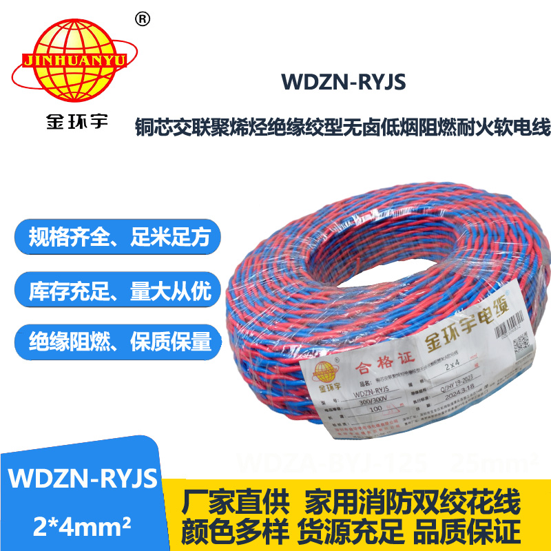 WDZN-RYJS全稱銅芯聚烯烴絕緣阻燃耐火型連接軟線、對絞多股軟線,簡稱雙絞線。WDZN-RYJS 2*4是由2根4平方的電線相互對絞制作而成,帶阻燃耐火特性。