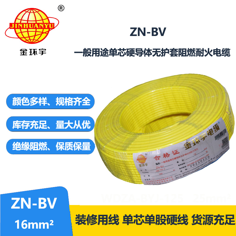 ZN-BV16平方就是導(dǎo)線截面為16平方毫米的銅芯聚氯乙烯絕緣阻燃電線,由一根銅線組成,多用于450/750V及以下動力裝置、日用電器、儀表用線及固定的埋設(shè)當(dāng)中。
