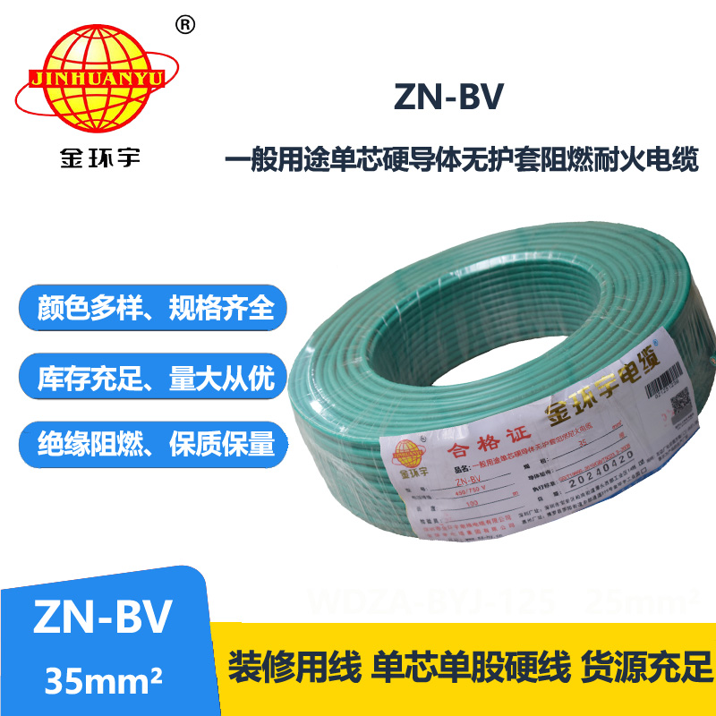 ZN-BV35平方就是導(dǎo)線截面為35平方毫米的銅芯聚氯乙烯絕緣阻燃電線,由一根銅線組成,多用于450/750V及以下動力裝置、日用電器、儀表用線及固定的埋設(shè)當(dāng)中。